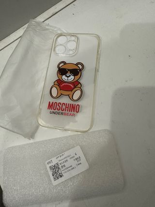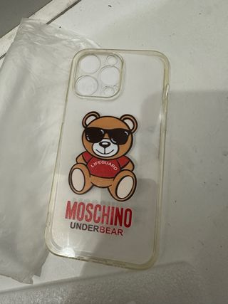 Cover trasparente per iPhone 14 Pro Max con stampa di un orsetto Moschino. - Design con orsetto stilizzato. - Scritta Moschino Underbear sul fondo. - Materiale trasparente.