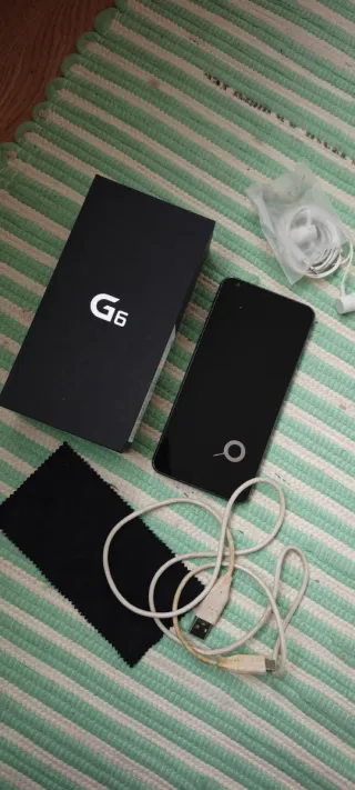 Telefono mobile LG G6 in colore nero. Include la scatola originale e gli accessori. - USATO MA ANCORA FUNZIONANTE - Scatola originale LG G6. - Auricolari. - Cavo di ricarica USB ma senza l'adattatore, solo il cavo.