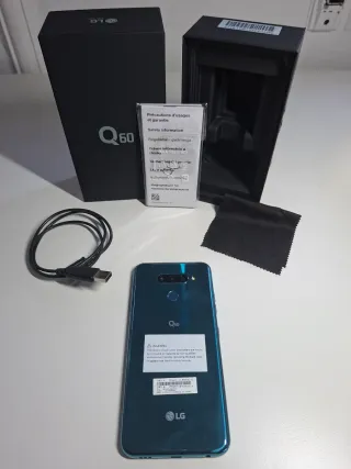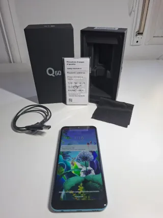 Telefono mobile LG Q60 con 64GB di spazio di archiviazione. Nuovo. Include: scatola originale, cavo USB e manuale di sicurezza. SPEDIZIONE SOLO.