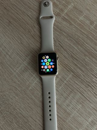 Smartwatch Apple Watch Serie 1 con finitura dorata. - Cinturino in silicone color grigio chiaro. - Schermo con icone delle applicazioni. - Con caricatore.