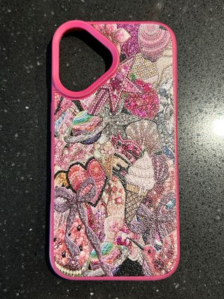 Elegante custodia per iPhone 16 con un design scintillante e dettagli colorati. - Decorazioni a tema dolce e floreale. - Bordi in rilievo rosa. - Finitura glitterata.