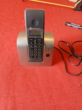 Telefono cordless Motorola con base. Design moderno in color argento e nero. Tastiera numerica completa.