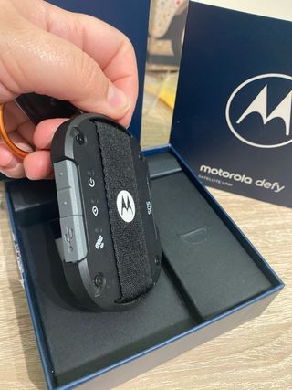 Dispositivo di comunicazione satellitare Motorola Defy. Design compatto e resistente. Cinturino di fissaggio regolabile. Pulsante SOS arancione. Logo Motorola visibile.