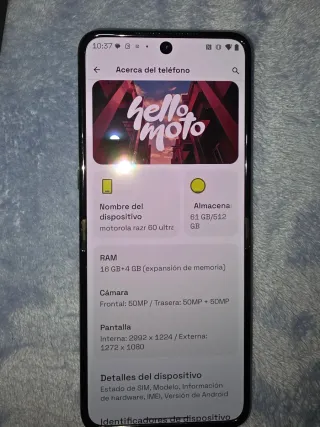 Telefono cellulare Motorola Razr 60 ultra con 512 GB di memoria interna. - Schermo interno: 2992 x 1224 - Schermo esterno: 1272 x 1080 - RAM: 16 GB + 4 GB (espansione della memoria) - Fotocamera frontale: 50MP - Fotocamera posteriore: 50MP + 50MP In ottime condizioni e con la sua scatola...