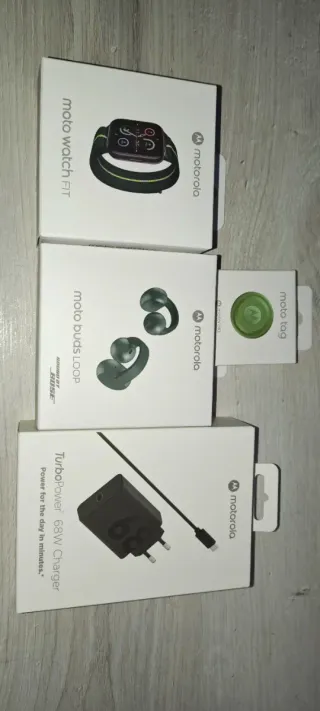 Set di accessori Motorola. - Moto Watch Fit - Moto Buds Loop - Moto Tag - Caricatore TurboPower 68W
