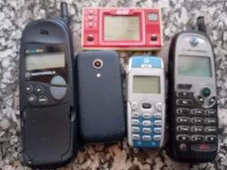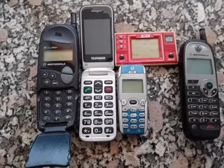 Lote di telefoni mobili antichi di diverse marche. Include modelli di Motorola, Alcatel e Telefunken. Varietà di design e colori. Ideale per collezionisti o amanti della tecnologia retrò.