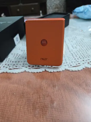 Telefono cellulare Motorola Razr 50 in colore arancione. Design pieghevole. Logo Motorola sul retro. Nome 'razr' inciso nella parte inferiore.