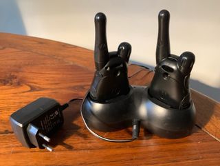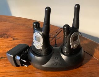 Coppia di walkie talkie Motorola T5532 in colore nero. Include base di ricarica doppia e adattatore di corrente. Base di ricarica per due unità. Adattatore di corrente incluso.