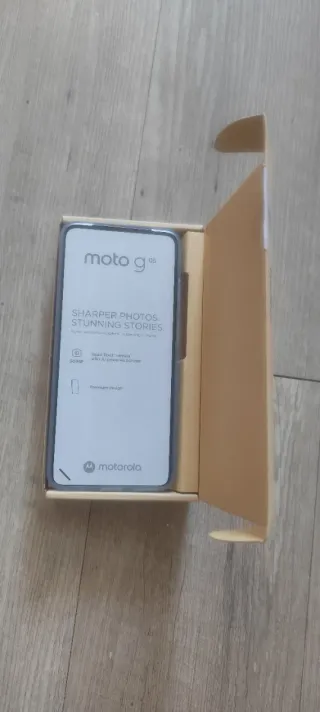 Scatola originale del telefono cellulare Motorola Moto G 35 5G. - Design in colore beige. - Logo Motorola nella parte inferiore. - Solo aperta per la foto, senza utilizzo.