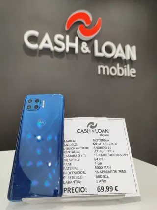 Telefono cellulare Motorola Moto G 5G Plus da 64GB in colore blu. Grado estetico bronzo. Include cavo di ricarica e un anno di garanzia. - Schermo LCD da 6,7 FHD+. - Fotocamera posteriore da 16+8 MPX e anteriore da 48+2+8+5 MPX. - Batteria da 5000 mAh. - Processore Snapdragon 765G. CASH LOAN MOBILE. Negozio di telefonia nuova, usata e ricondizionata affidabile in Avda. Constitución 53, Torrejón de Ardoz, Madrid.
