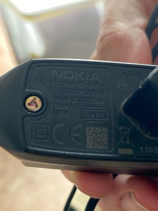 Caricabatterie da parete Nokia AOP-125. - Tensione di ingresso: 100-240V AC. - Frequenza: 50-60Hz. - Corrente di ingresso: 180mA. - Tensione di uscita: 5.7V DC. - Corrente di uscita: 800mA. - Certificazione LPS.