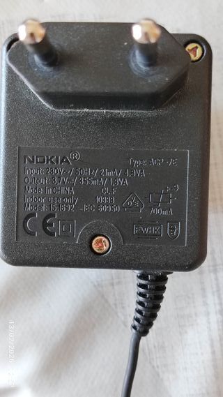 In vendita caricabatterie da parete per dispositivi Nokia, modello ACP-7E. Ha una tensione di 3,7 volt e un connettore da 3,5 mm. I modelli compatibili sono Nokia 3310, 3210, 1100, 5110, 6210, 6310, 6310i, 6600, 6630, 7110, 7650, 8210, 9210, N-Gage e N-Gage QD, tra gli altri. Altri: Nokia 2100, 3100, 3510, 3510i, 5210, 6100, 6610, 7210, 7250.