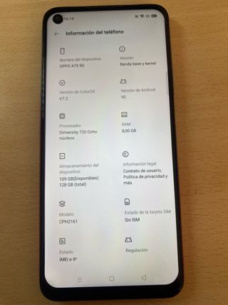 Telefono mobile OPPO A73 5G con grande capacità di archiviazione. FUNZIONA PERFETTAMENTE - Processore Dimensity 720. - 8 GB di RAM. - 128 GB di archiviazione totale. - Versione Android 10. - ColorOS V7.2.