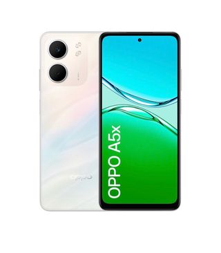 Telefono mobile Oppo A5x in bianco con un design moderno. - Doppia fotocamera posteriore. - Schermo nitido. - Design elegante.