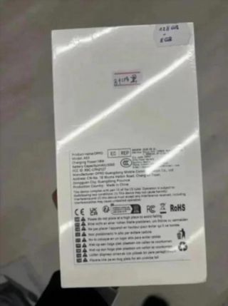 Scatola originale dell'Oppo A5 5G. L'imballaggio è in perfetto stato. Design moderno ed elegante. Logo Oppo visibile nella parte inferiore.