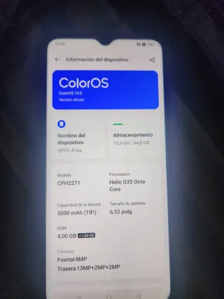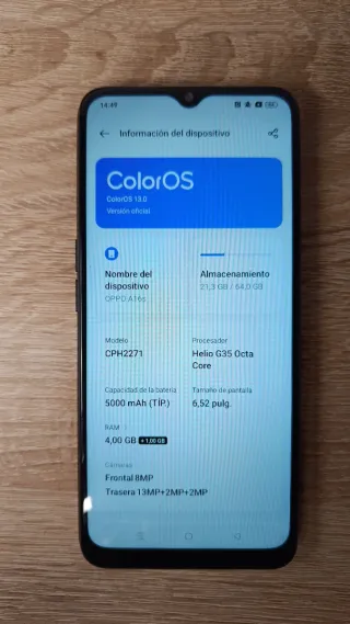 Telefono mobile Oppo A16s con schermo da 6,52 pollici. In perfette condizioni, un anno di utilizzo. - Processore Helio G35 Octa Core. - Batteria da 5000 mAh. - Fotocamera frontale da 8MP. - Tripla fotocamera posteriore da 13MP+2MP+2MP. - 4GB di RAM espandibili nello stesso dispositivo.