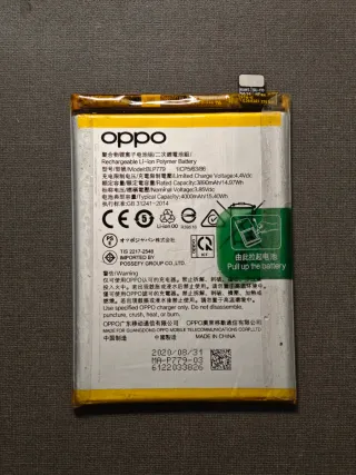 Batteria originale BLP779, proveniente da un Oppo Reno4 Z 5G CPH2065. Ha qualche segno d'uso ma funziona correttamente, viene consegnata carica al 100%. Compatibile con: - Oppo Reno4 Z 5G - Oppo A92S - Oppo A93 - Oppo F17 Pro - Oppo Reno4 Lite.