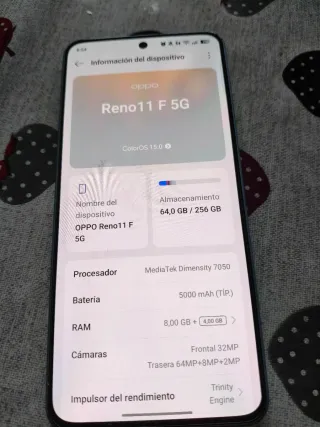 Telefono mobile Oppo Reno11 F 5G con grande capacità di archiviazione. Include caricabatterie (solo cavo) e custodia. - Schermo con ColorOS 15.0. - Processore MediaTek Dimensity 7050. - Batteria da 5000 mAh. - 8 GB di RAM + 4 GB virtuali. - Fotocamera frontale da 32MP. - Fotocamera posteriore tripla: 64MP + 8MP + 2MP. - Trinity Engine per prestazioni elevate.
