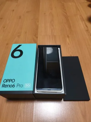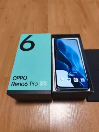 Smartphone Oppo Reno 6 con finiture eleganti. - Colore nero/blu navy. - Memoria interna da 128 GB. - Include caricabatterie e cavo. - Custodia protettiva inclusa.