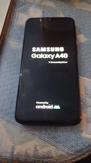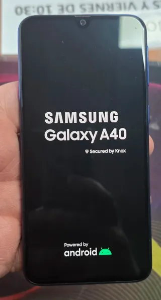Samsung Galaxy A40 acceso e funzionante, schermata di avvio visibile. Presenza di graffi. Sistema Android originale con protezione Knox. Smartphone compatto, pratico e affidabile, adatto a chiamate, messaggi e utilizzo delle principali app.