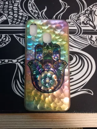 Custodia protettiva per Samsung Galaxy A40 con un design accattivante. In buone condizioni. Prezzo negoziabile. Design di Hamsa con dettagli in colori vivaci. Finitura iridescente con effetto squame. Proteggi il tuo dispositivo con stile.