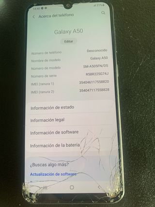Telefono mobile Samsung Galaxy A50. - Modello: SM-A505FN/DS - Numero di serie: R58R225G74J - IMEI (slot 1): 354046117558820 - IMEI (slot 2): 354047117558828 - Informazioni sullo stato - Informazioni legali - Informazioni sul software - Informazioni sulla batteria