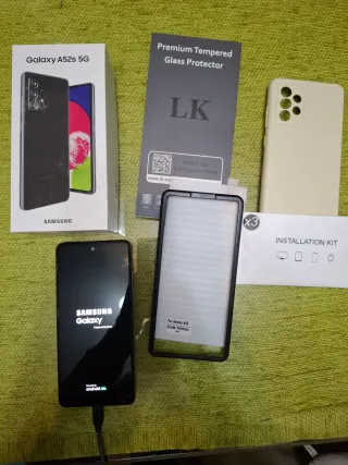 Samsung Galaxy A52s 5G. Colore nero. 128 GB e 6 GB RAM. Include custodia protettiva, protezione per la fotocamera e protezione per lo schermo. Caricatore incluso. Consegna nella scatola originale.