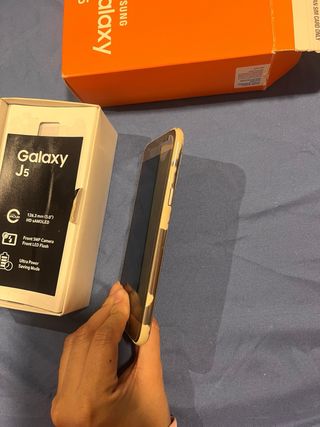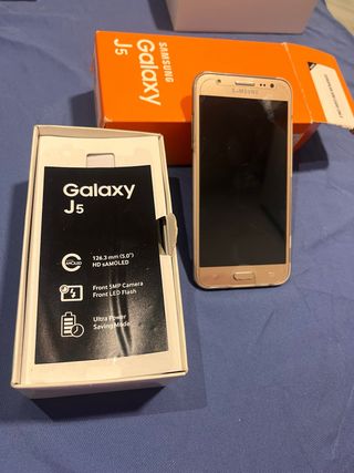 Telefono Samsung Galaxy J5 in color oro, nuovo e conservato per anni. - Schermo HD Super AMOLED da 5.0 pollici. - Fotocamera frontale da 5MP con flash LED. - Modalità di Super Risparmio Energetico.