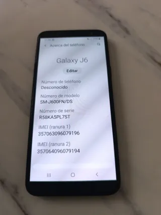 Teléfono móvil Samsung Galaxy J6. Pantalla perfecta. Sin cargador y cable. No recogida.Solo envio por wallapop. - Modelo: SM-J600FN/DS - Número de serie: RF8K830CMTH - IMEI (ranura 1): 359491095431928 - IMEI (ranura 2): 359492095431926