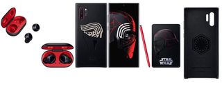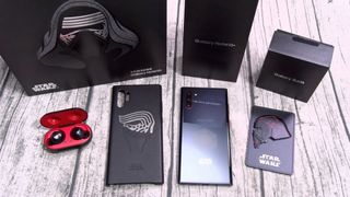 Edizione speciale di Samsung Galaxy Note 10+ ispirata a Star Wars. Include accessori a tema. - Scatola originale con design di Kylo Ren. - Custodia protettiva nera con design di Star Wars. - Auricolari wireless Galaxy Buds in custodia rossa. - Carta collezionabile di Star Wars.