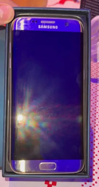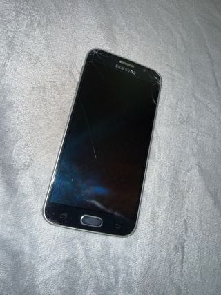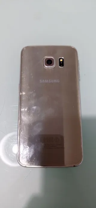 Telefono cellulare Samsung Galaxy S6 Edge. Colore oro e argento. Manca il porta SIM, c'è una crepa sul vetro ma non influisce sull'uso. Si vende solo il telefono, senza cavo né caricabatterie.