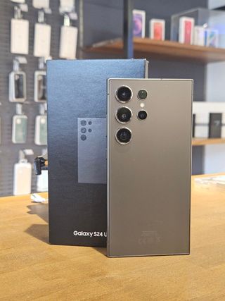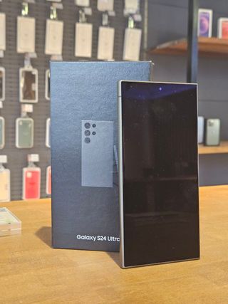 Telefono cellulare Samsung Galaxy S24 Ultra in colore grigio/nero. Include caricatore originale e scatola.