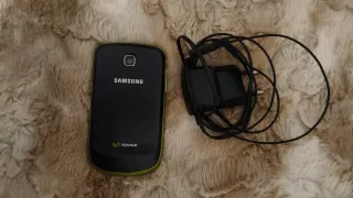 Telefono cellulare Samsung Galaxy Mini. Colore nero con dettagli verdi. Memoria RAM: 384 MB. Archiviazione interna: circa 160 MB. Espandibile con microSD. Include caricabatterie.