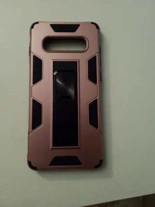 Custodia protettiva per Samsung Galaxy S10 Plus in colore Oro Rosa. Design robusto con supporto integrato. Finitura metallica Oro Rosa, dettagli in nero, supporto posteriore pieghevole.