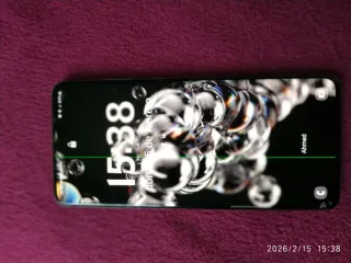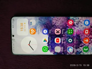 Telefono cellulare Samsung Galaxy S20 Plus. - Schermo con alcune crepe visibili. - Il telefono mostra la data 15 febbraio 2026.