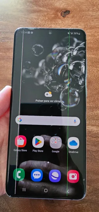 Telefono cellulare Samsung Galaxy S20 Ultra 5G. Schermo con linee verdi verticali, non influisce sul suo utilizzo. Se si desidera riparare è possibile. Il telefono è ben curato, ha solo l'angolo rotto accanto alla fotocamera, si è rotto dopo un mese e non è mai caduto a terra. Lo vendo nella sua scatola originale, con vetro protettivo per lo schermo e una custodia (visibile nella foto) NON INCLUDE CARICABATTERIE NÉ AURICOLARI. SE NECESSITI DI PIÙ FOTO MI CONTATTI