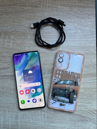 Telefono cellulare Samsung Galaxy S21 FE in colore verde. Processore Snapdragon 888, memoria RAM 6GB, memoria di archiviazione 128GB. Schermo in perfette condizioni, il microfono per le chiamate si sente un po' basso. Include: scatola, caricabatterie, cavo e una custodia in buone condizioni.