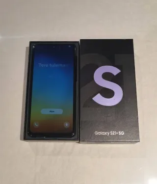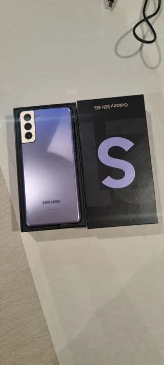 Vendo telefono mobile Samsung Galaxy S21+ 5G. Incluso con custodia, caricabatterie originale Samsung con ricarica rapida, di solito non fornito, e scatola originale. Design elegante in color viola e nero.