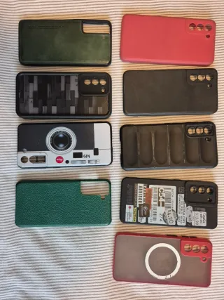 Set di nove custodie per Samsung Galaxy S21 5G. - Custodia verde con texture, in pelle - Custodia verde in pelle - Custodia rossa - Custodia nera con design geometrico - Custodia nera liscia - Custodia con design Leica - Custodia nera con fessure - Custodia nera con etichette - Custodia trasparente con anello magnetico.