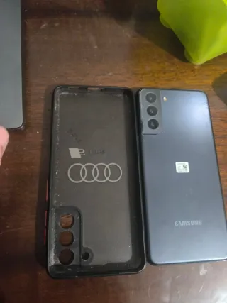 Telefono cellulare Samsung Galaxy S21+ in colore nero. Schermo in buone condizioni. Copertina posteriore leggermente danneggiata ma con funzionamento perfetto e revisione eseguita 2 mesi fa con sostituzione della batteria. Capacità di archiviazione di 128 GB.