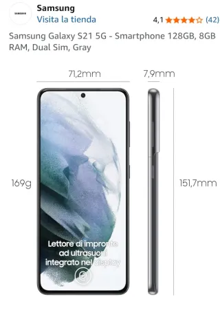 Telefono cellulare SAMSUNG GALAXY S21 5G. - Schermo da 6,2 pollici. - Tripla fotocamera posteriore. - Connettività 5G. - Colore Grigio. ACQUISTATO SU AMAZON RICONDIZIONATTO MA NON USATO!!! CONSEGNATO SENZA SCATOLA E RICARICATORE. NON CAMBIA