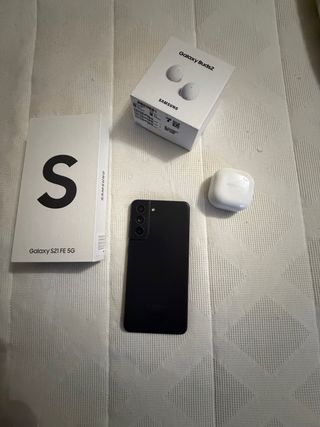 In vendita confezione di Samsung Galaxy S21 FE 5G in colore nero e auricolari wireless Galaxy Buds 2 in colore bianco. - Modello di telefono: Galaxy S21 FE 5G. - Colore del telefono: Nero. - Modello di auricolari: Galaxy Buds 2. - Colore degli auricolari: Bianco.