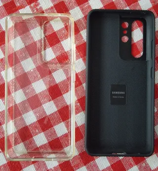 In vendita due custodie per Galaxy S21 Ultra. - Custodia trasparente. Modello Ultra Hybrid di Spigen. - Custodia nera con supporto. Ufficiale Samsung.