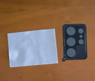 Protettore per la fotocamera di uno smartphone Samsung Galaxy Ultra, compatibile con i modelli S21/S22/S23/S24/S25. Include un panno di pulizia in microfibra lungo 8 cm. Nuovo, non aperto.