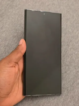 Samsung Galaxy S22 Ultra con 256GB di memoria interna. Il dispositivo è di colore nero. Ha una macchia nel display come si vede nelle foto che non pregiudica il funzionamento - Caricabatterie incluso. - Cavo USB-C incluso.