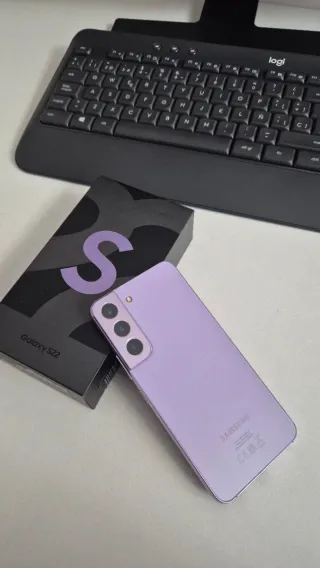 Telefono cellulare Samsung Galaxy S22 in colore Bora Purple. Senza graffi o urti (ha sempre avuto una cover in silicone e protezioni per lo schermo e la fotocamera. Il telefono funziona perfettamente, senza alcun segno di malfunzionamento. Batteria al 97%. Unico proprietario con fattura di acquisto. Viene fornito con la sua scatola originale senza cavo né caricabatterie. In regalo una nuova cover in silicone da provare.
