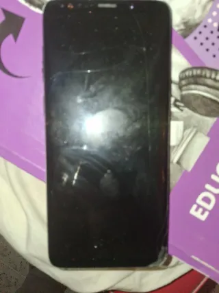 Telefono mobile Samsung Galaxy S9+ in colore nero, lo schermo e la parte posteriore presentano piccole crepe, non ha il pulsante di accensione, batteria, fotocamera e tutto funziona perfettamente senza problemi.