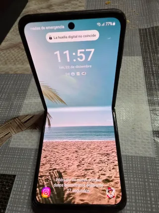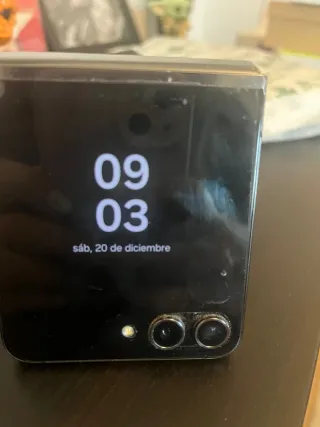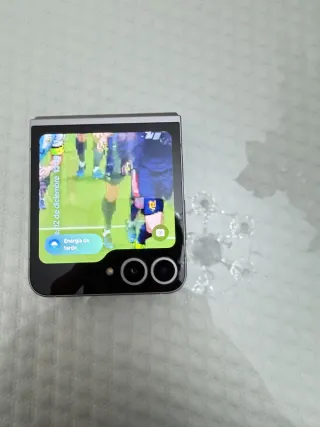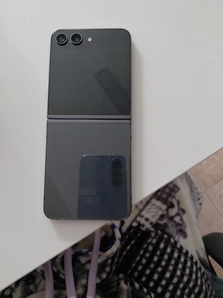 Telefono mobile Samsung Galaxy Z Flip 5 con finitura nero e grigio. Il suo design pieghevole lo rende molto compatto e facile da trasportare. Ha un piccolo graffio sullo schermo visibile nella foto. Non influisce sul funzionamento del telefono (da qui il prezzo). Viene fornito con caricatore e scatola. Il prezzo è negoziabile. - Schermo pieghevole. - Design moderno ed elegante.