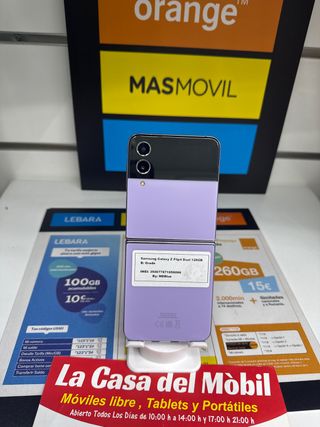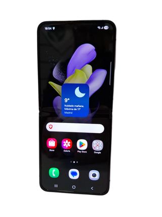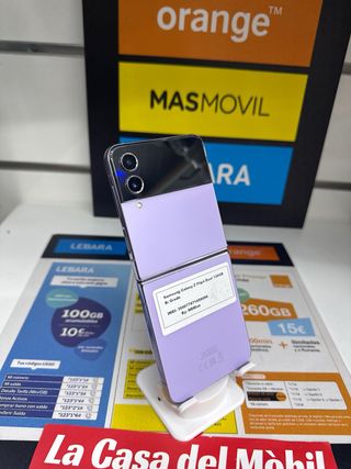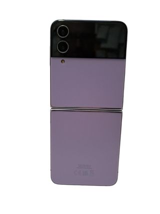 Telefono mobile Samsung Galaxy Z Flip 4 in colore viola con 128GB di spazio di archiviazione. Include garanzia. Il telefono è nuovo di fabbrica e funziona perfettamente.
