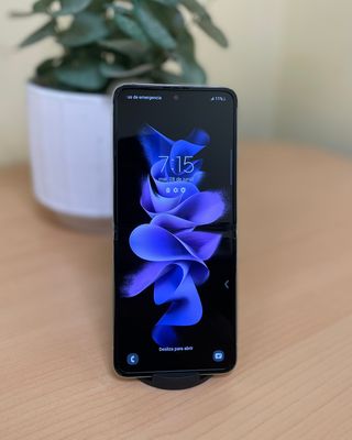 Telefono cellulare Samsung Galaxy Z Flip 3 5G in colore nero. Funziona perfettamente. Cerniera senza problemi. Ben conservato. Deterioramento normale d'uso. Capacità di 256 GB.
